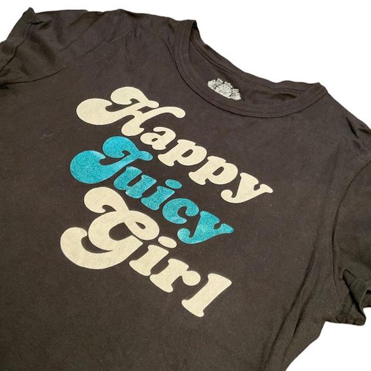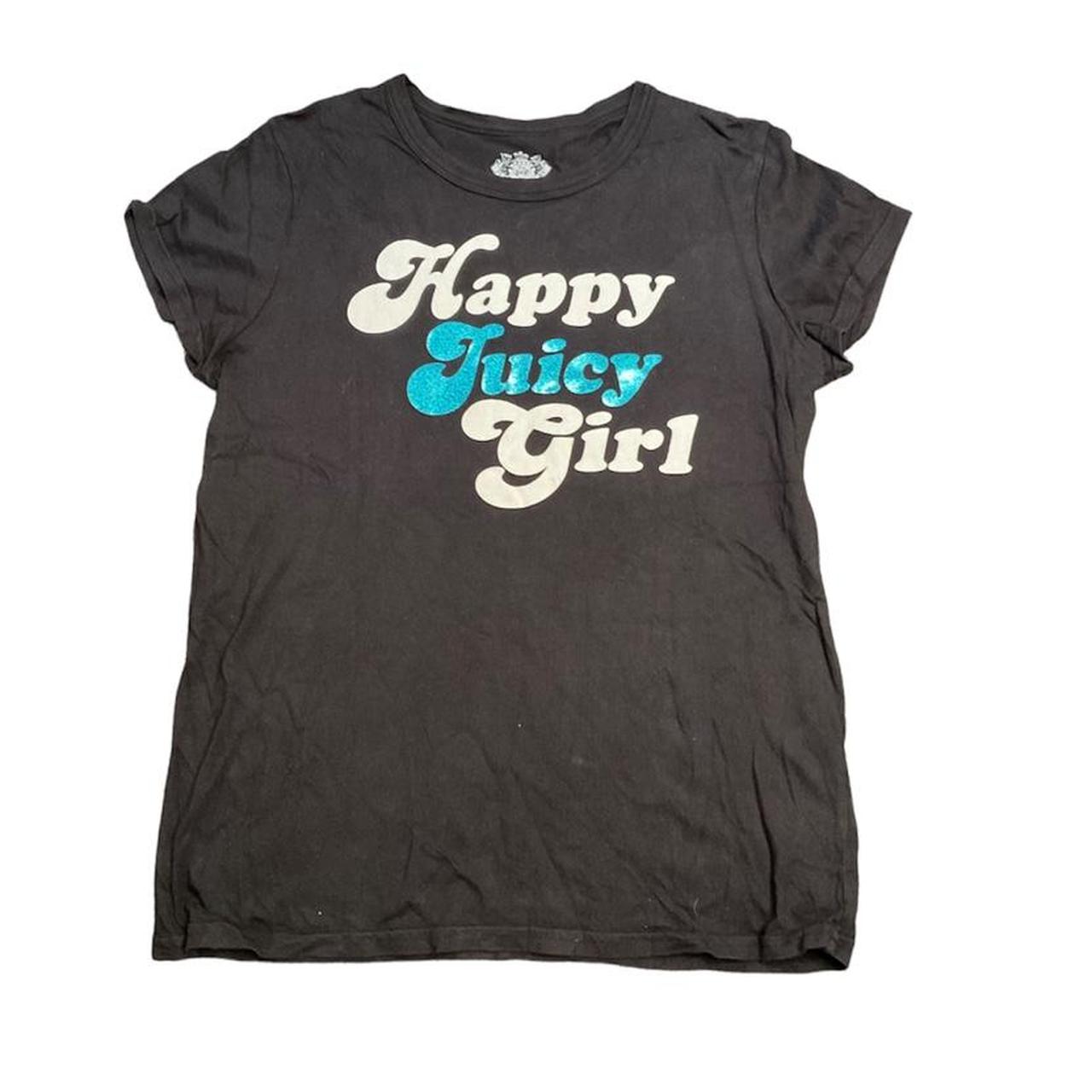 Happy juicy girl. Glittery juicy logo. Labeled a size extra large but can fit a small to medium to large as it is stretchy. Can also fit a extra small for a looser fit. Such a sick top and great for every day wear or for going out. Stunt on ‘em!